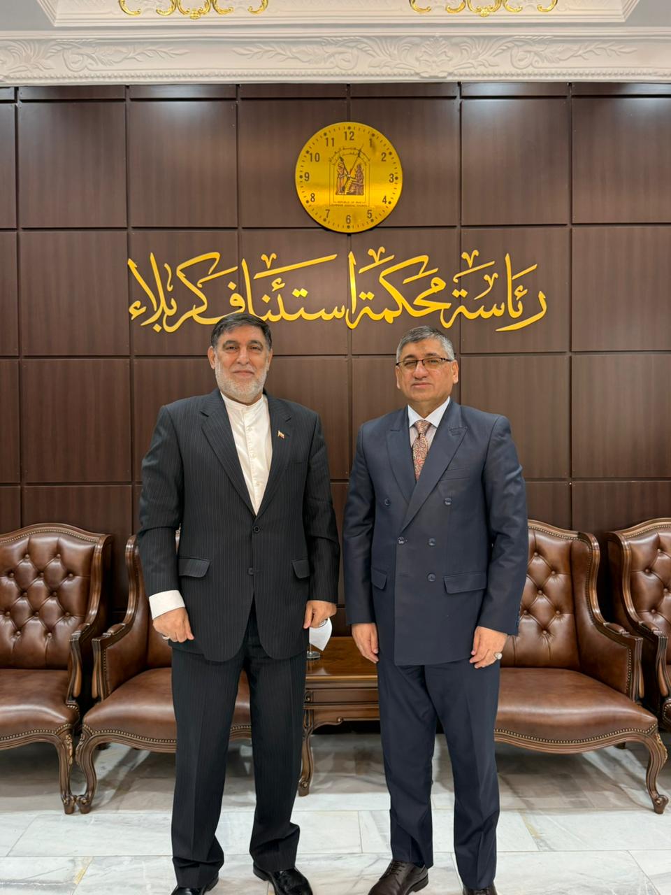 جعفر صفری کفیل سرکنسولگری جمهوری اسلامی ایران در کربلای معلی، روز دوشنبه مورخ 12 آبانماه 1404 با احمد هادی رئیس دادگاه استیناف کربلاء، دیدار و پیرامون مسائل قضایی، کنسولی و امور زندانیان بحث و تبادل نظر کرد.